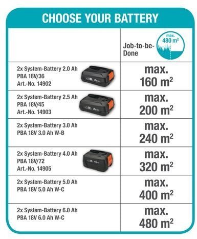 Der Akku-Rasenmäher PowerMax™ 32/36V P4A wird solo ohne Ladegerät und Akkus geliefert. Du kannst ein 18V-System der POWER FOR ALL ALLIANCE einsetzen, einer der größten markenübergreifenden Akku-Allianzen führender Hersteller. Deren Akkus sind mit zahlreichen Geräten rund ums Haus und den Garten kompatibel – was bedeutet, dass Du nicht mehr für jedes einen extra Akku brauchst. So sparst Du Geld und bist flexibel! Du willst das Gerät mit Akkusystem kaufen? Kein Problem – dann ist das Ready-To-Use Set das richtige für Dich. Power für Deine Ideen.