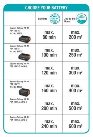 Dank einer LED-Anzeige direkt am Griff bist Du immer über den aktuellen Ladezustand informiert. Mit dem mitgelieferten Akku beträgt die Laufzeit bis zu 100 Minuten oder 250 Quadratmeter Hecke.