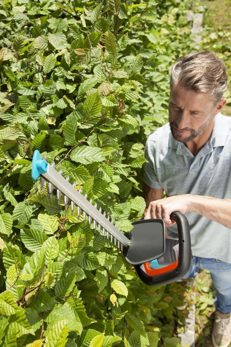 Die kraftvolle Heckenschere eignet sich für den komfortablen Rückschnitt mittelgroßer und großer Hecken besonders gut. Durch die ausgewogene Balance lässt sich die Heckenschere auch bei längeren Einsätzen optimal führen. Der umlaufende ErgoLine Handgriff liegt in jeder Schneidposition komfortabel in der Hand, vor allem beim Schnitt der seitlichen Heckenpartien. Die Auslösetaste kann in jeder Position leicht bedient werden. Lasergeschnittene Präzisionsmesser sorgen für einen effizienten, schnellen und sauberen Schnitt von Zweigen und Ästen.
