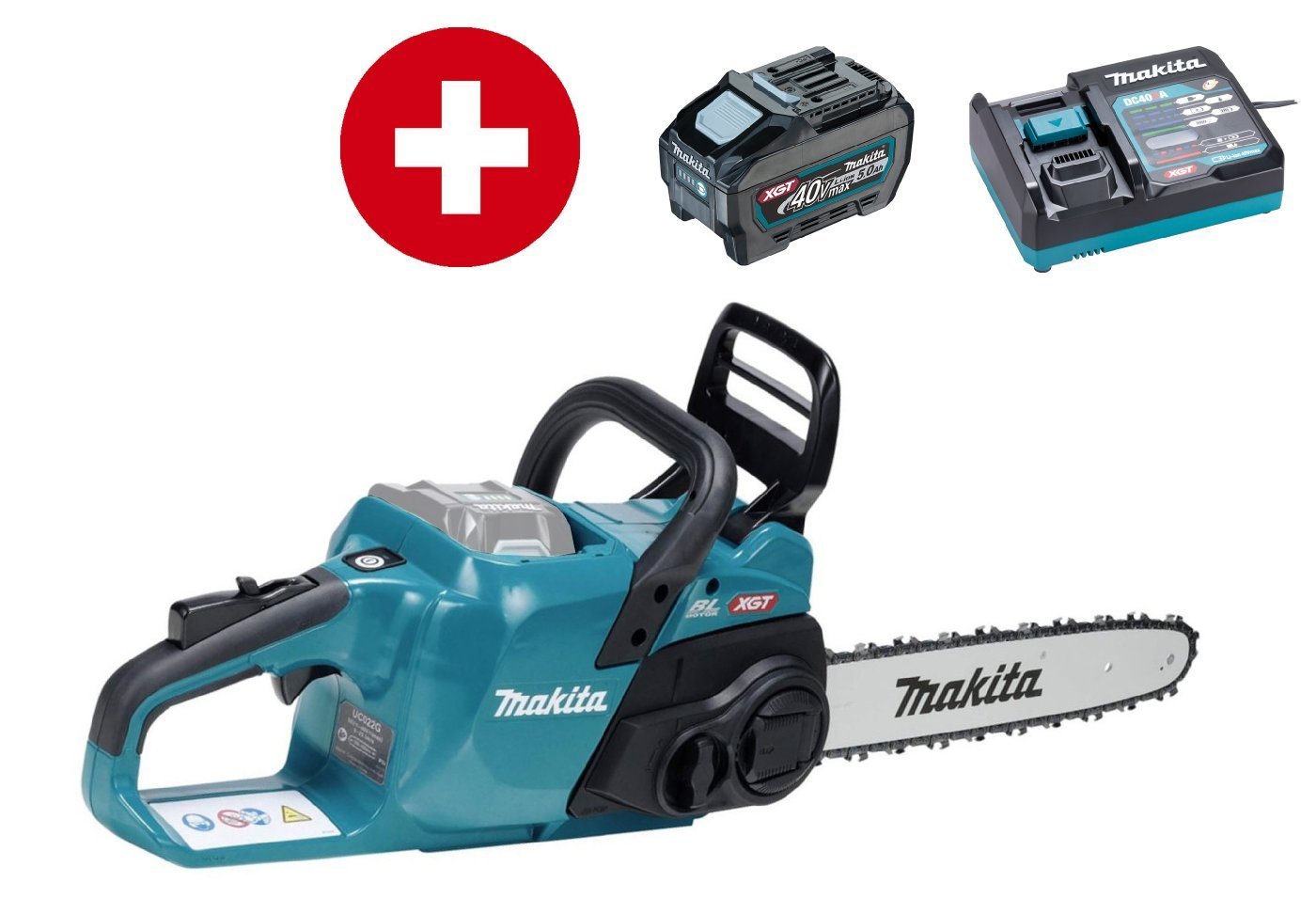 Makita Akku-Kettensäge UC022GT101 mit Schnellladegerät DC40RA und Akku BL4050F mit 5,0 Ah