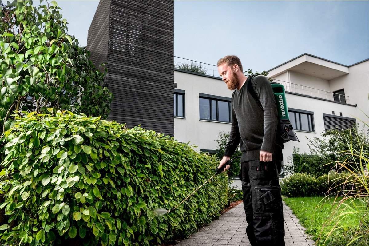Das Metabo Rückensprühgerät RSG 18 LTX 15 ist ein akkubetriebenes Rückensprühgerät zum gleichmäßigen Besprühen von Pflanzen ohne manuelles Pumpen. Sie ist geeignet für Pestizide (Herbizide, Insektizide, Fungizide etc.), Flüssigdünger, Pflanzenstärkungsmittel und Wasser. Eine exakte, anwendungsgerechte Dosierung der Sprühmenge ist durch den stufenlos einstellbaren Arbeitsdruck ohne Probleme möglich. Zusätzlich wird das Sprühbild über eine elektronisch gesteuerte Pumpe konstant gehalten. Die Düse ist Regulierbar und bietet so einen einfachen und schnellen Wechsel zwischen Sprühnebel und Strahl. Damit das Gerät Ihnen möglichst lang zur Verfügung steht ist eine Sicherheitsabschaltung eingebaut, welche vor thermischer Überlastung schützt. Gleichzeitig sorgt ein integriertes Filtersystem, dass das Gerät nicht von innen verschmutzt oder verstopft. Sollte der Arbeitseinsatz mal ein wenig länger dauern, so brauchen Sie keine Angst vor längerem Tragen haben. Das Sprühgerät bietet einen hohen Tragekomfort, welches durch einer ergonomischen Tankform und gepolsterten Schultergurten mit Klick-Verschluss gegeben wird. Danach kann das Gerät schnell und einfach gereinigt oder entleert werden, da es über eine große Tanköffnung verfügt.