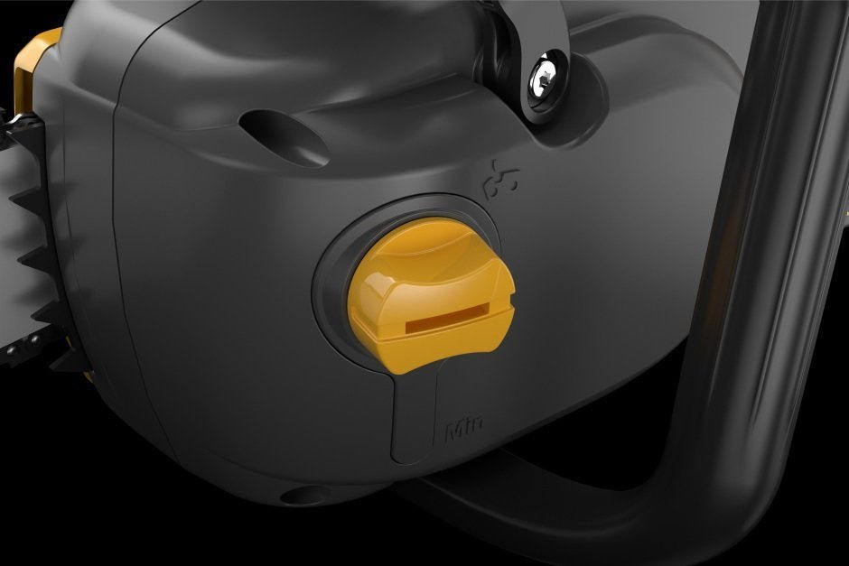 Die integrierte Mutter an der Seite der Kettenabdeckung erleichtert das Spannen der Kette. Die Kettengeschwindigkeiten wird mit der Softkey-Tastatur gewechselt: 16 m/s für energiesparendes Sägen oder 20 m/s für schnelleres, durchgängiges Sägen. Ein kurzer Blick auf die LEDs des Bedienfeld bietet auch bei starker Sonneneinstrahlung deutlich wichtige Informationen wie Kettengeschwindigkeit, Akkustatus und aktivierte Bremsen. Ein Blick auf das Schauglas am Ölbehälter informiert über den Füllstand des Kettenschmieröls.