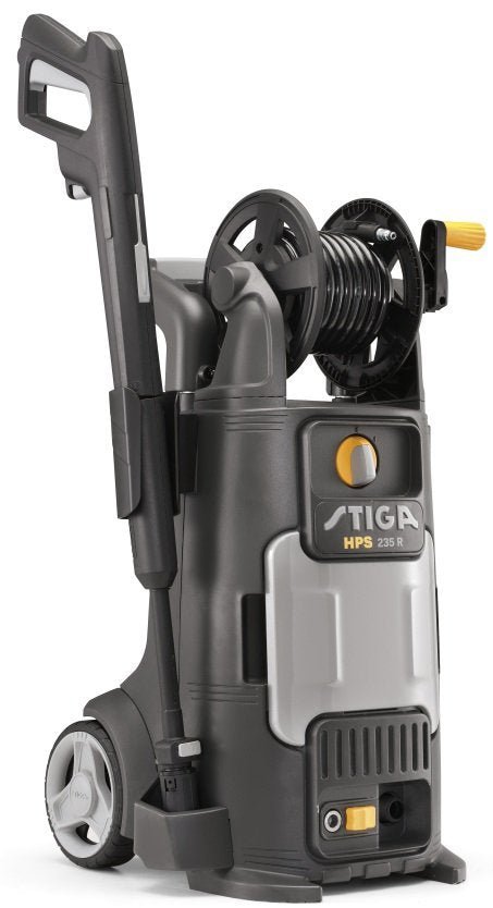 Der STIGA Hochdruckreiniger HPS 235 R wurde zur komfortablen und einfachen Reinigung von mittelgroßen Oberflächen konstruiert. Dieser Kaltwasser-Hochdruckreiniger wird von einem 1.800 W Elektromotor angetrieben, der einen maximalen Druck von 135 bar mit einer Durchflussrate von 440 l/Std. liefert. Der 6 Meter Hochdruckschlauch kann mithilfe der Schlauchtrommel aufgerollt werden. Der HPS 235 R ist sehr leicht, stabil und einfach zu transportieren mit 150 mm Kunststoffrädern und einem Teleskopgriff. Zudem verfügt er über praktische Fächer zum Verstauen von Zubehör. Er eignet sich ideal für herausfordernde Reinigungsaufgaben von Oberflächen, einschließlich Gartengeräten und Maschinen, Terrassen, Höfen und Treppen, Fahrrädern, Motorrädern und Autos, Bürgersteigen, Gehwegen und Gegenständen aus Holz.