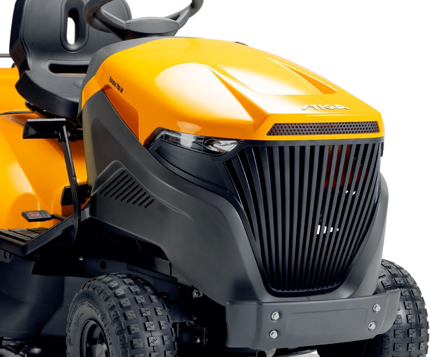 Die serienmäßig im Lieferumfang enthaltene robuste Stoßstange schützt verlässlich die Motorhaube des Rasentraktors