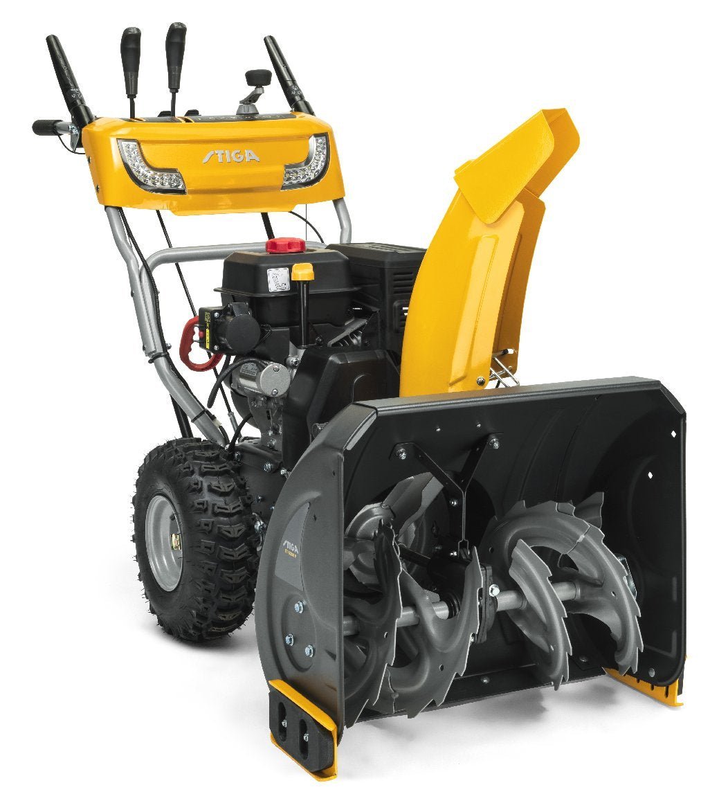 Räumt Schnee von mittelgroßen bis großen Flächen. STIGA ST 5266 P ist eine zuverlässige, effektive zweistufige Schneefräse, die von einem 302-cm³-Benzinmotor WS 300 von STIGA angetrieben wird und mit einer 66 cm breiten Fräse mit gezahnter Schnecke ausgestattet ist. Die Schneefräse STIGA ST 5266 P kann praktisch jede Art von Schnee bearbeiten und bis zu 12 Meter weit auswerfen. Die umkehrbaren Gleitkufen und die 16 Zoll großen Snow-Hog-Reifen bieten optimalen Halt in sechs Gängen. Dank des neuen Antriebs mit Easy-Turn-Technologie zur automatischen Auslösung der Differentialsperre ist die ST 5266 P extrem wendig. Die Maschine wurde für einen komfortablen Betrieb selbst unter anspruchsvollsten Bedingungen entwickelt und mit speziellen LED-Scheinwerfern, beheizten Griffen und einem E-Starter mit 230 V ausgestattet. Alle Steuerungen sind bequem über das Bedienfeld zu erreichen.
