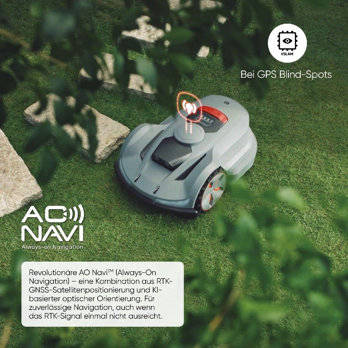 Das AONavi™ System nutzt die modernste RTK-GNSS-Satellitenpositionierung zusammen mit VSLAM-Visualtechnologie. Dies gewährleistet, dass der X7 auch auf komplexen Rasenschnitten präzise navigiert und die Grenzen effizient erkennt.